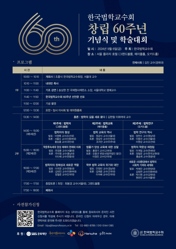 목록 답변 2024 한국법학교수회 창립 60주년 기념식 및 학술대회 (2024.09.06) 작성자 관리자 작성일 25-01-13 14:26 | https://youtu.be/1sR7q27zjCE?si=_Gw6SxPtC9iwea_v[2388] 본문 2024년 9월 6일 한국법학교수회에서 주최한 [한국법학교수회 창립 60주년 기념식 및 학술대회] 자료를 올려드립니다. 다음글 목록 답변