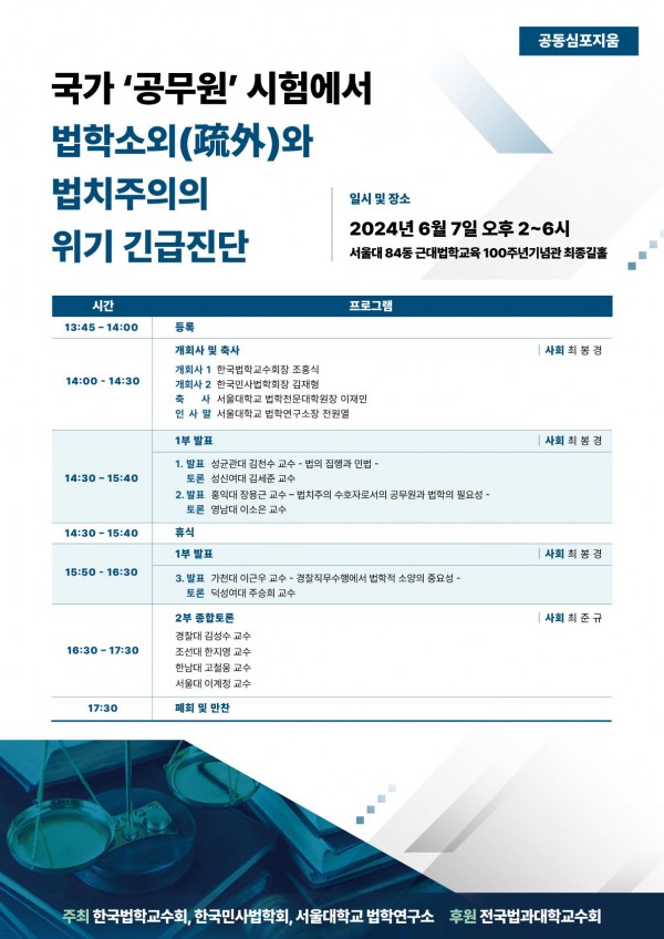 목록 답변 2024 전국법과대학교수회 공동심포지움 (2024.06.07) 작성자 관리자 작성일 25-01-13 14:23 | 본문 2024년 6월 7일에 진행한 [2024년 전국법과대학교수회 공동심포지움 - 국가 '공무원' 시험에서 법학소외(疏外)와 법치주의의 위기 긴급진단] 의 자료를 올려드립니다. 이전글다음글 목록 답변